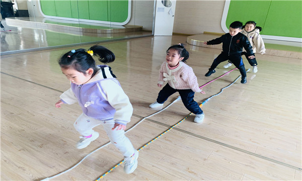 自由探索时间到!孩子们都带上了绳子,与自己的好朋友一起开始了跳绳的新玩法。有的孩子跳绳放在在地上的连接,组成了一条条的“小河”,进行跳跃;有的孩子利用绳子可弯可伸的特性,圈成圆圈玩起了“小动物找家”的游戏;有的孩子拉起绳子的两头,玩起了“钻山洞”等等。孩子们在游戏的过程中,体验到了自主、自由的乐趣,也体验到了创新的快乐。