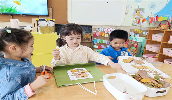 活动中,孩子们与爸爸妈妈共同收集漂亮的树叶,经过想象、构思、修剪、拼贴,展现了一幅幅独具创意的作品。回到幼儿园,孩子们再进行装饰,撕一撕、贴一贴,用稚嫩的小手展现了更具童趣的作品,这些作品成为了班级环境创设的一大亮点。同时,收集到的树叶也成为了孩子们的游戏材料,摆一摆、放一放,都能引发无穷的乐趣。