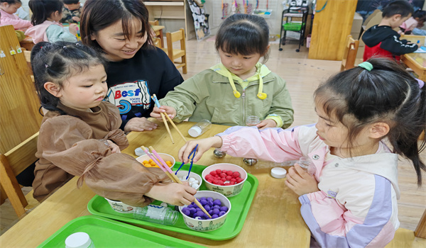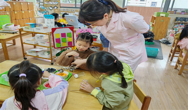 《指南》中指出,要创造条件和机会,促进幼儿手的动作灵活协调。在区域活动中,我们设置了丰富的游戏活动锻炼幼儿的手部灵活性。