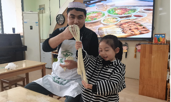 活动中,铁爸爸首先通过生动的讲解和图片展示,向孩子们介绍了回族的服饰、饮食等特色文化,让孩子们直观感受到不同民族的独特魅力。随后,他现场展示了回族传统拉面技艺:揉面、醒面、抻拉……一团普通的面团在他手中逐渐变成细匀筋道的面条,孩子们看得目不转睛,不时发出惊叹声。铁欣妍还作为“小助手”参与其中,亲手触摸面条,体验拉面的乐趣,现场掌声与欢笑声交织。